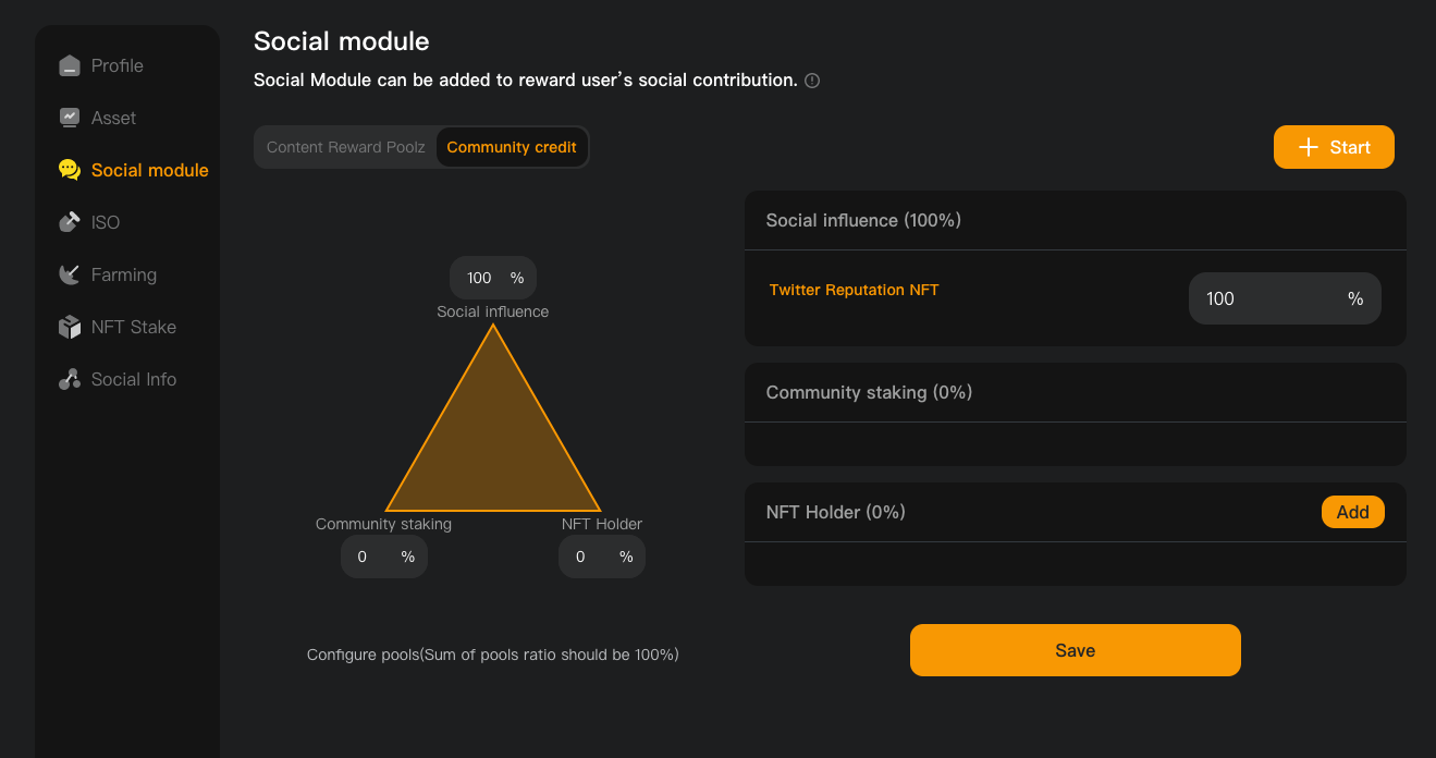 这些因子共同形成了社区成员在社区中的 credit,社区可配置其构成以及各部分占据的比例。在可扩展的投票流程中,credit 决定社区 $token 的分发。