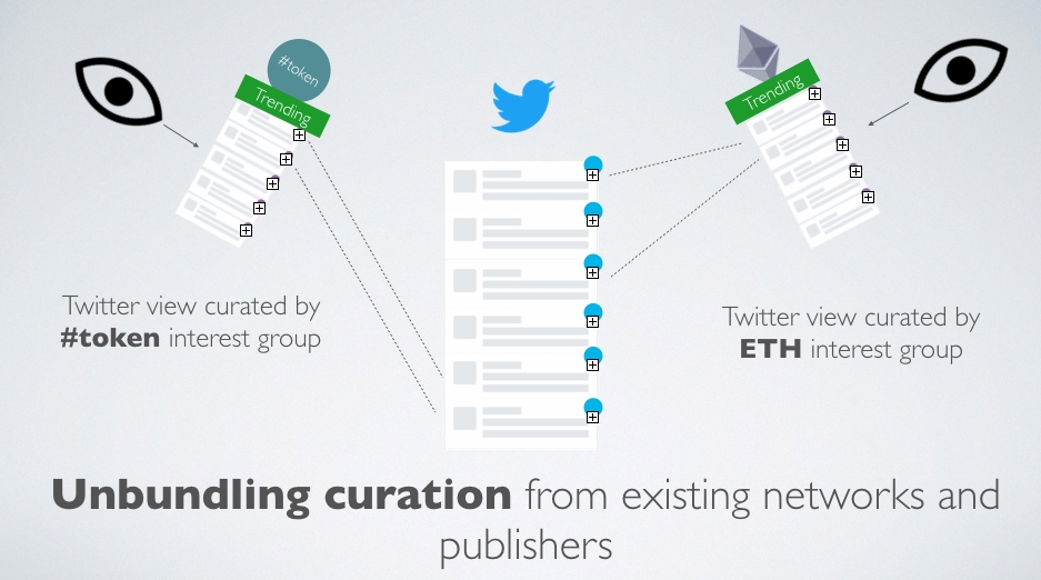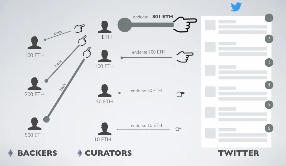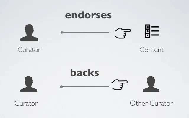 这是一种流动民主和 Google PageRank 的结合。通过认可内容(或者支持其他策展人),用户将其持有的社区 token 转化为内容和其他策展人的声誉信号。